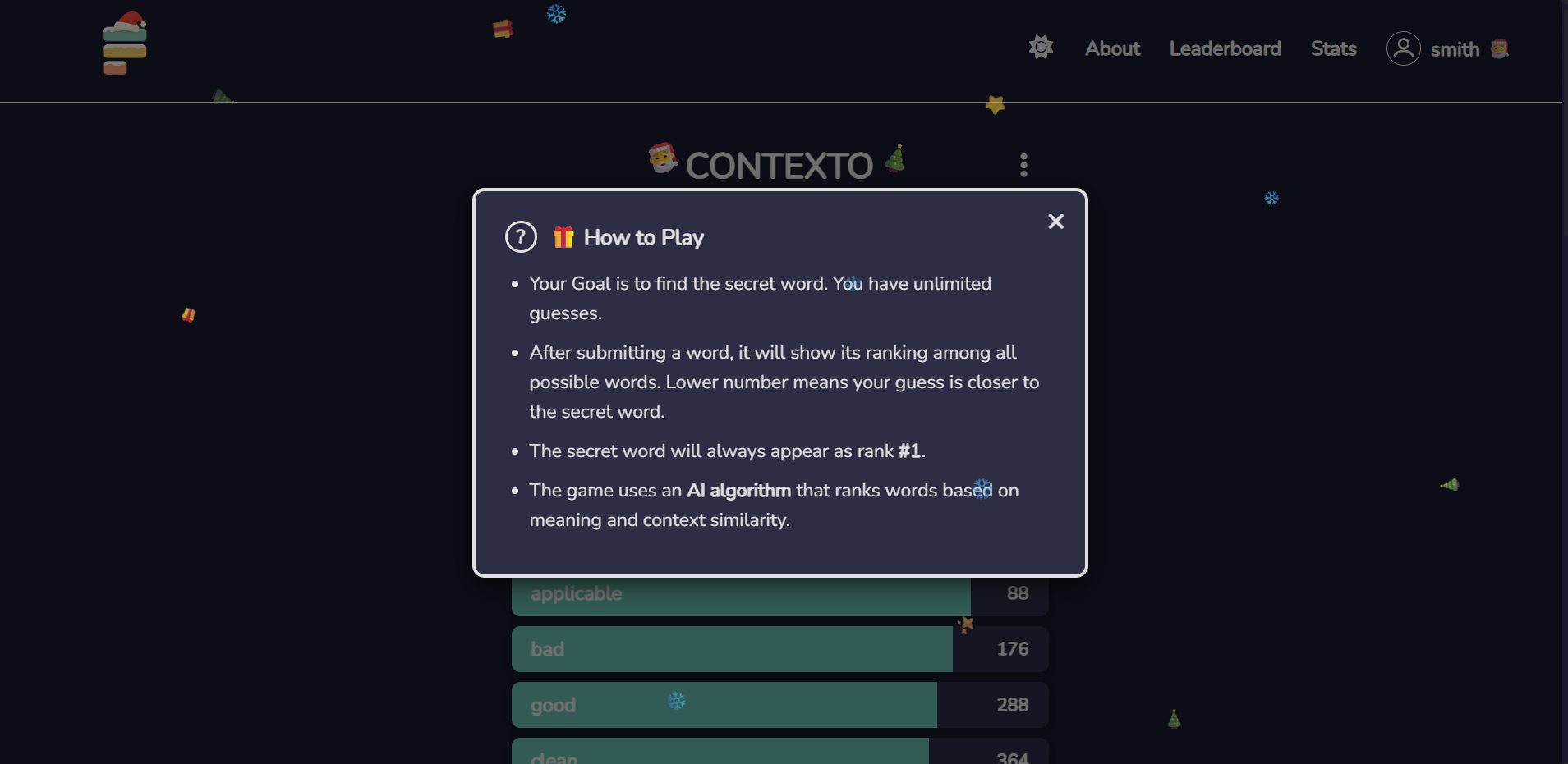 Contexto — a daily semantic word-guessing game. Submit words to discover the secret word using AI-driven similarity rankings. Unlimited attempts, daily hints, leaderboards and player stats to track your progress.