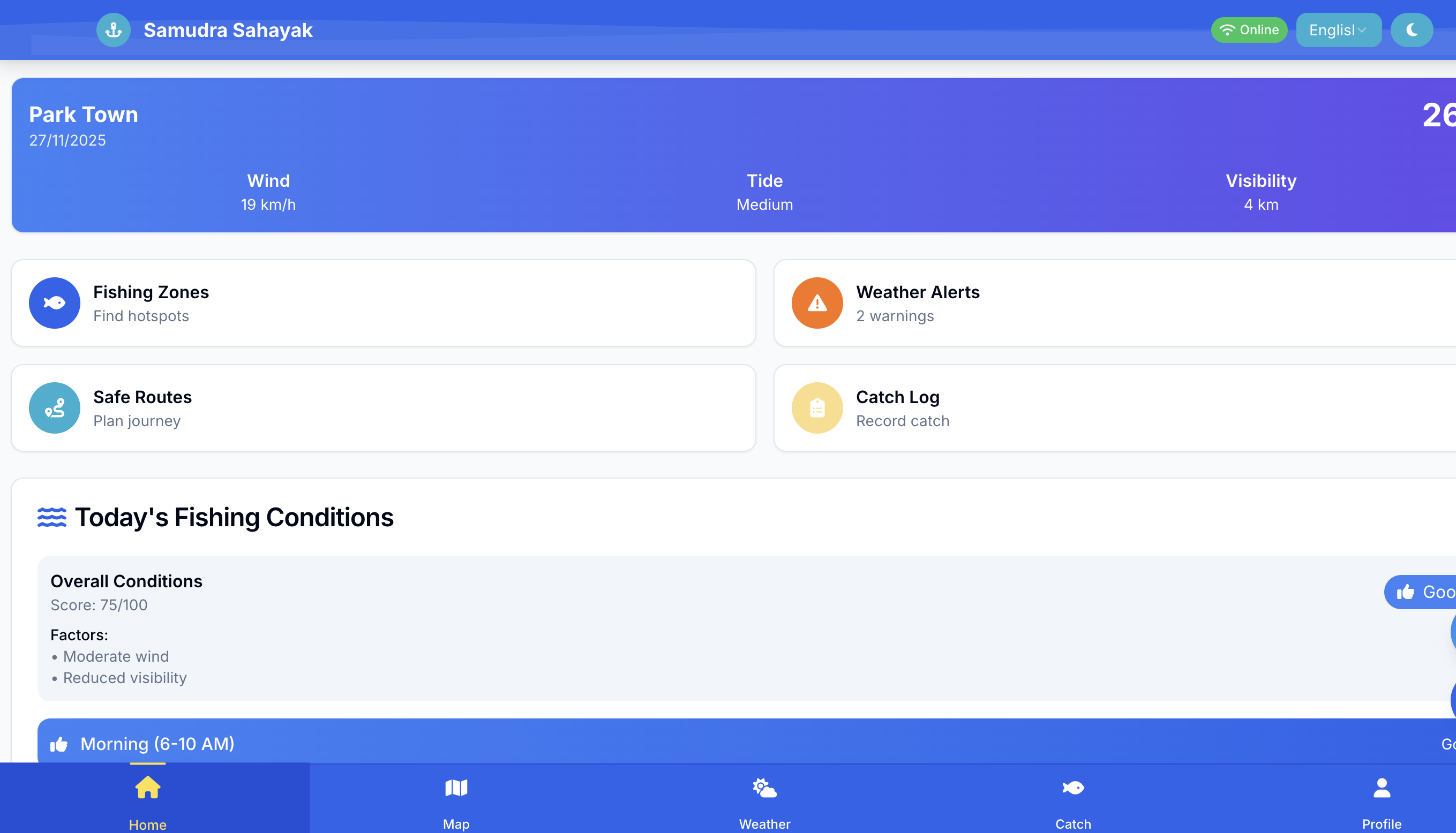 Samudra Sahayak helps coastal fishermen in India fish smarter with weather alerts, fishing zone predictions, GPS navigation, and AI chatbot support. Stay safe and catch more fish.