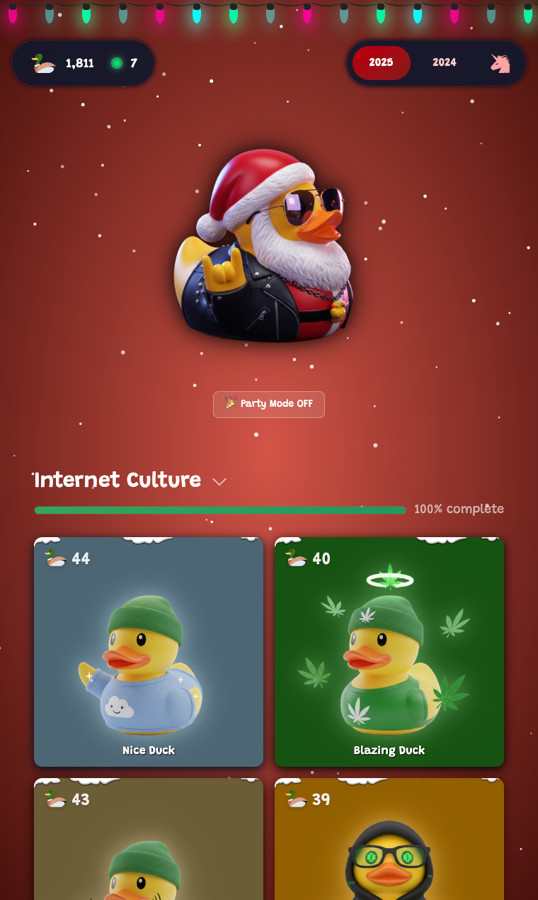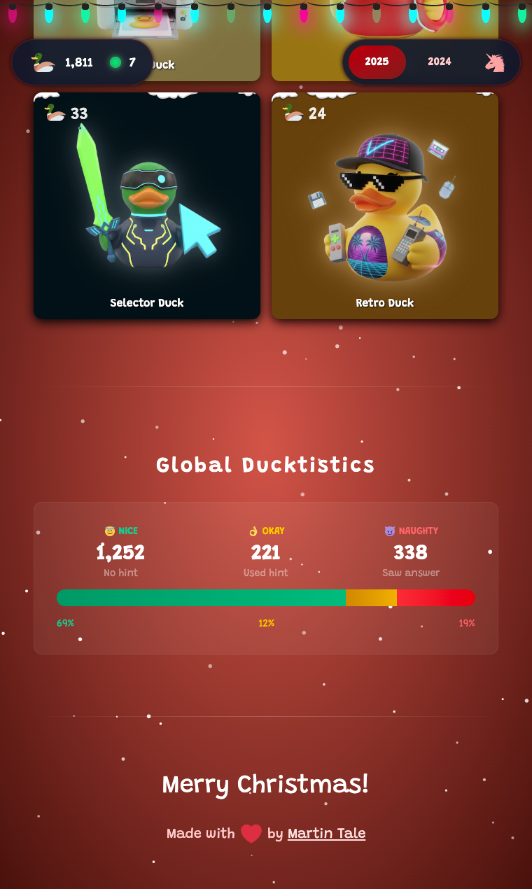 Hunt 46 hidden duck trophies packed with gaming Easter eggs, internet culture, and developer secrets! Unlock them through cheat codes, keyboard combos, and clever behaviors - then watch real-time stats as players worldwide join the hunt. 🦆 Plus, last year's kindness advent calendar is still live. Can you find them all? 🥰