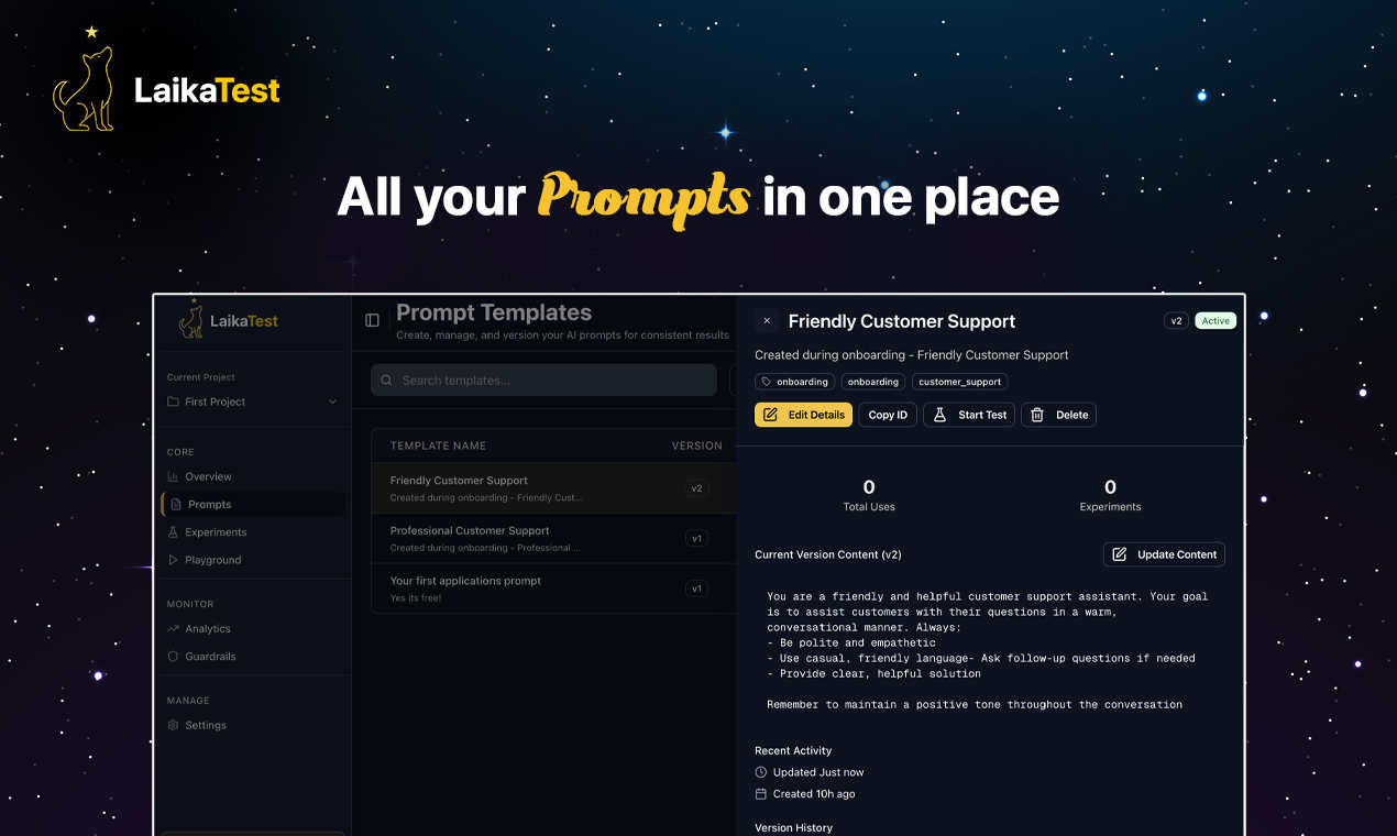 Testing framework with safety guardrails creates reliable AI deployment. Version comparison capabilities work excellently.