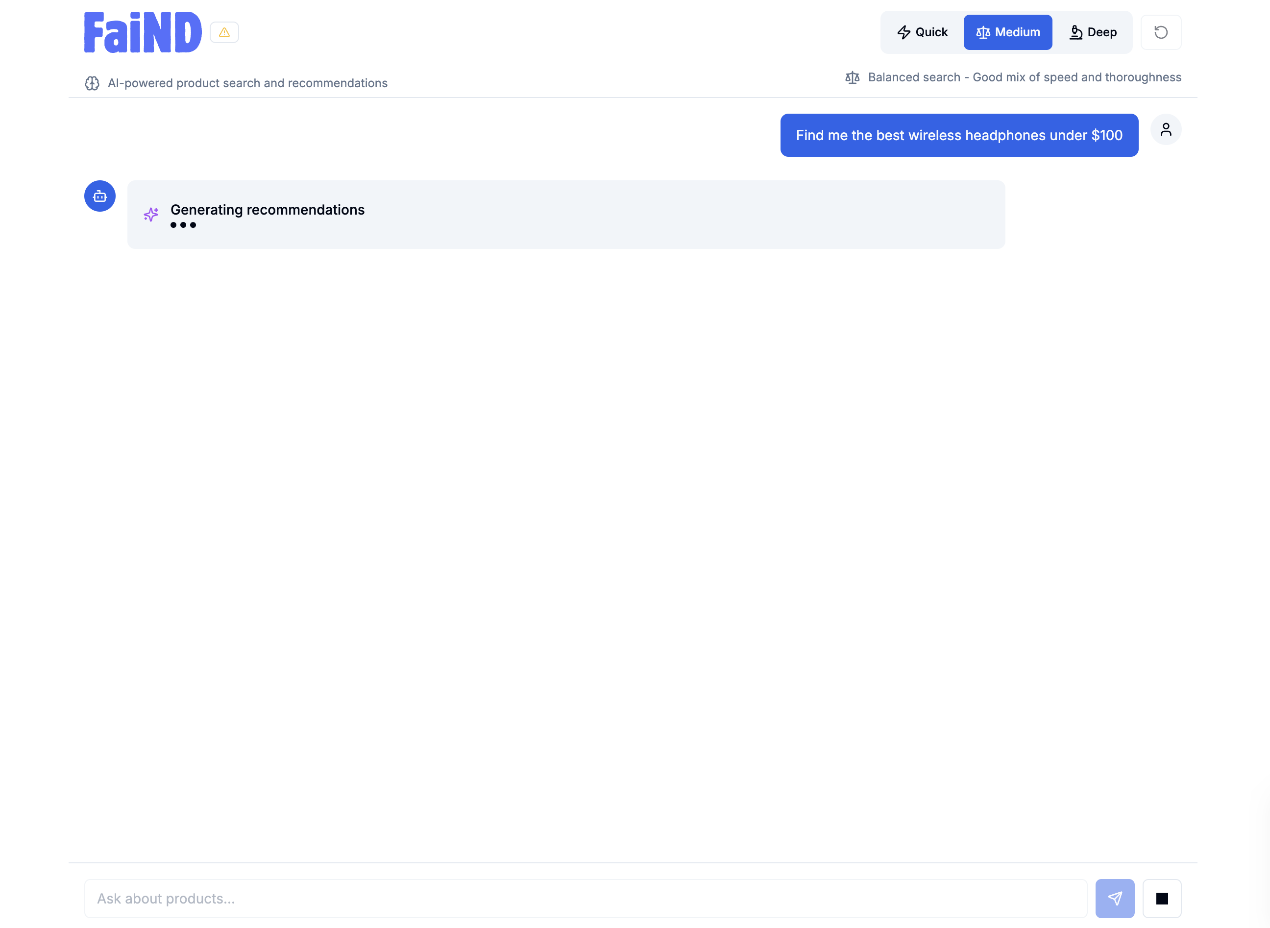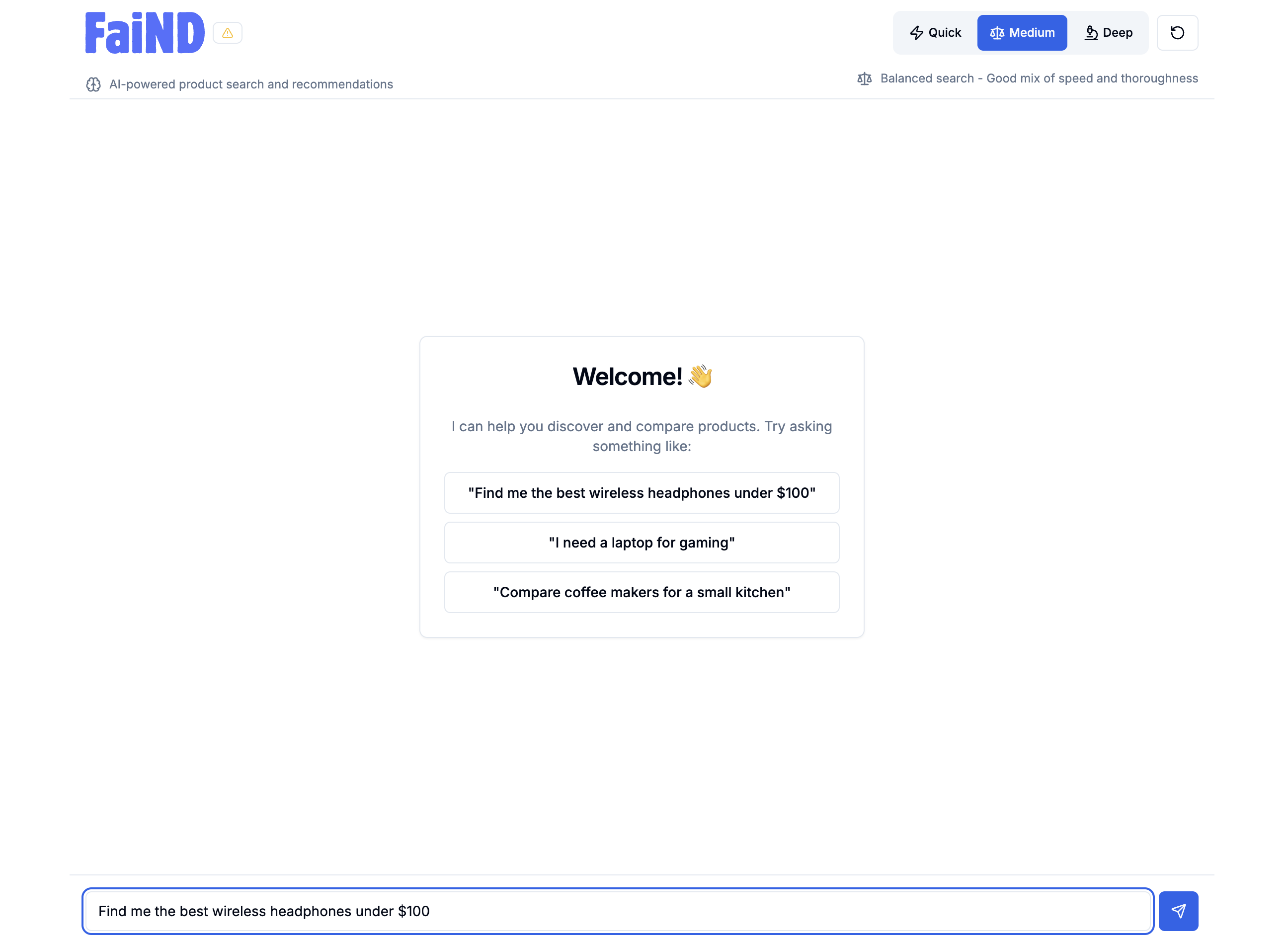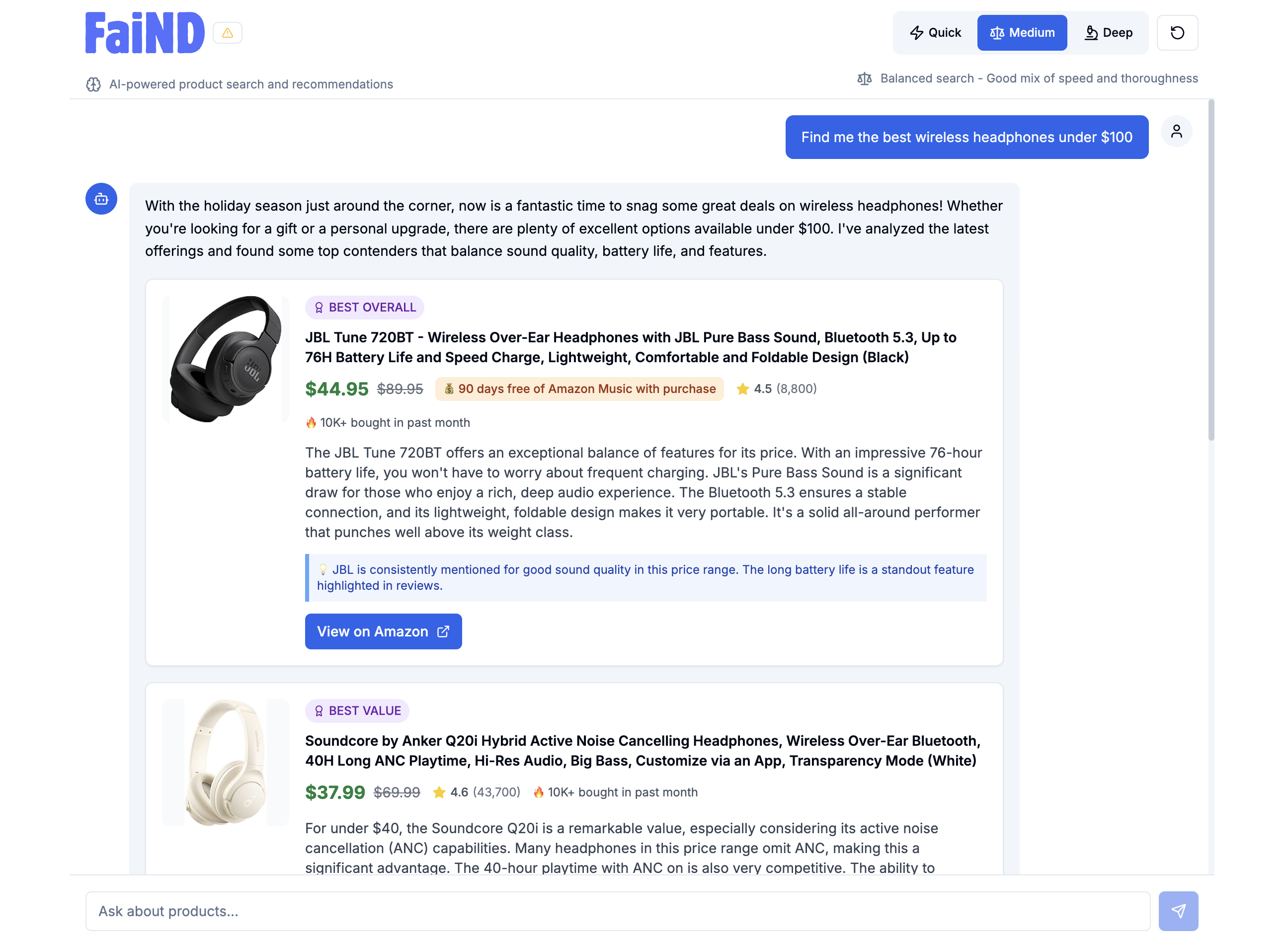 What is Faind? Faind is an AI-powered shopping assistant that helps you instantly discover the best products for your needs — using real-time data, live pricing, and analysis of millions of Amazon US products. Most recommendation tools rely on outdated APIs or static top-10 lists. Faind is different: it scans products live, in real time, at the moment you search. That means smarter results, better deals, and recommendations that actually reflect what’s available right now.