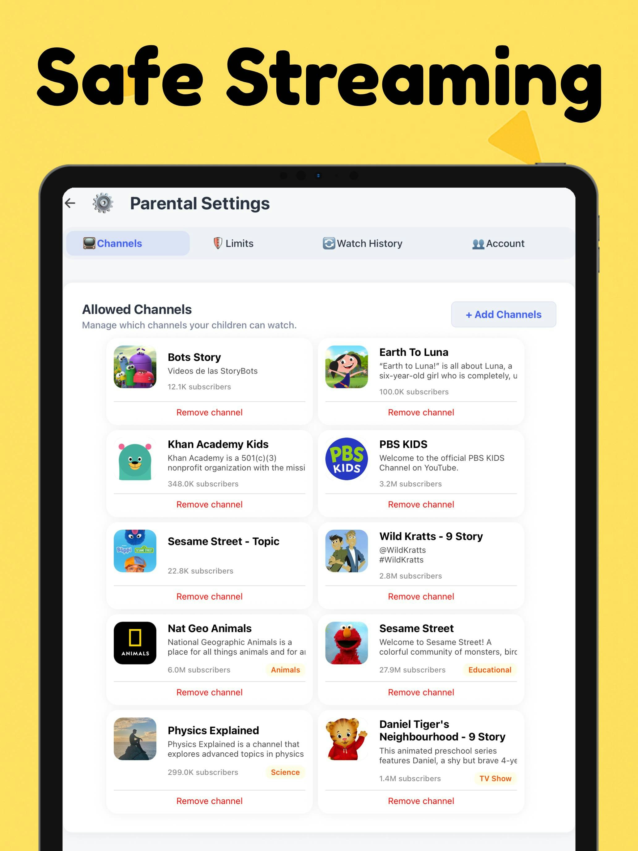 Solid parental control tool. The channel whitelist approach works well for our household. My kids can only see content from the 8 channels I've approved, which gives me peace of mind. The interface is clean and kid-friendly without being condescending. Would be nice if there was a time limit feature built in so I could set automatic cutoffs, but overall it does what it promises. No algorithm pushing random videos is the main selling point.