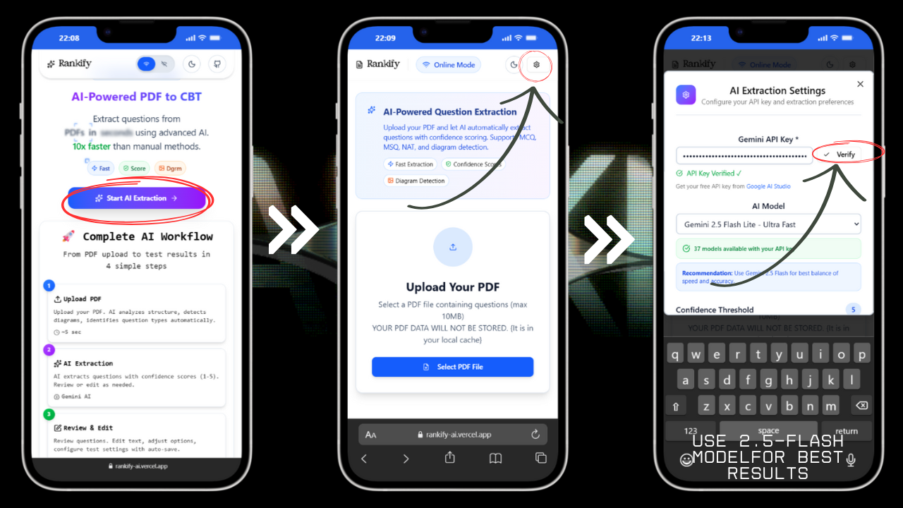 Transform any PDF question paper into an interactive CBT in seconds! Rankify uses AI to extract questions automatically, supports MCQ/MSQ/NAT formats, and provides real exam simulation with timer & analytics. Works 100% offline with client-side processing for privacy. Perfect for JEE/NEET aspirants who want realistic practice without manual setup. Privacy-first & free!