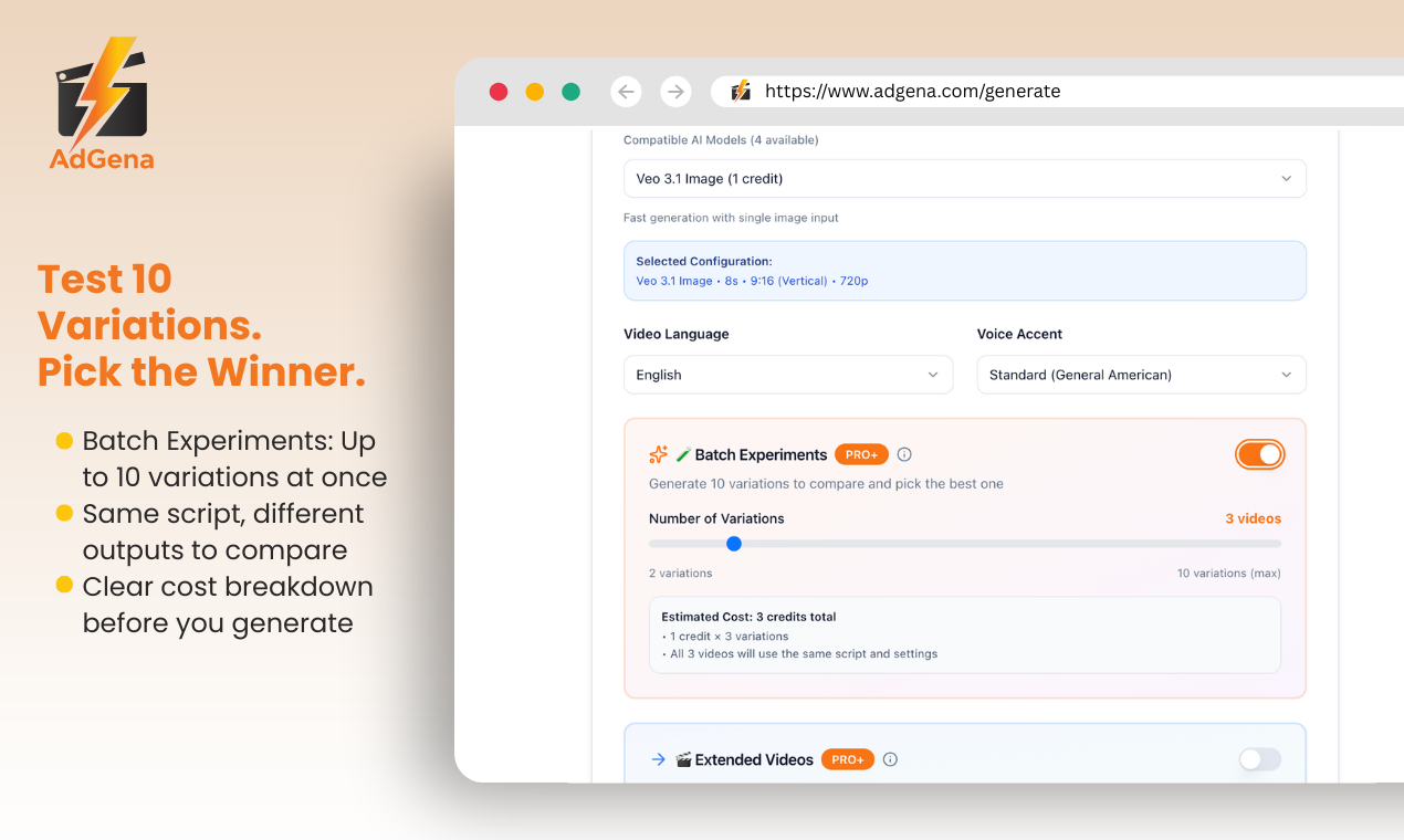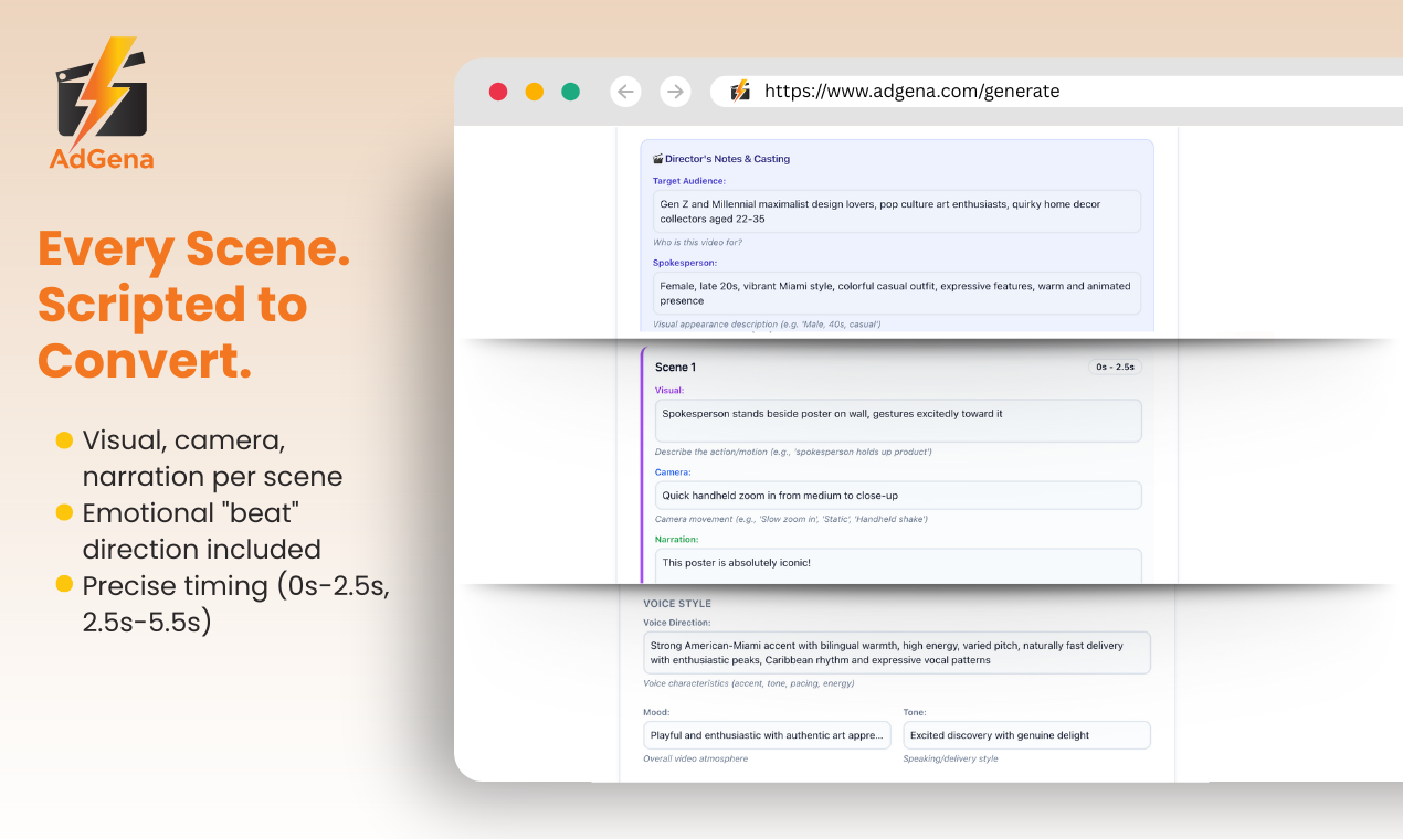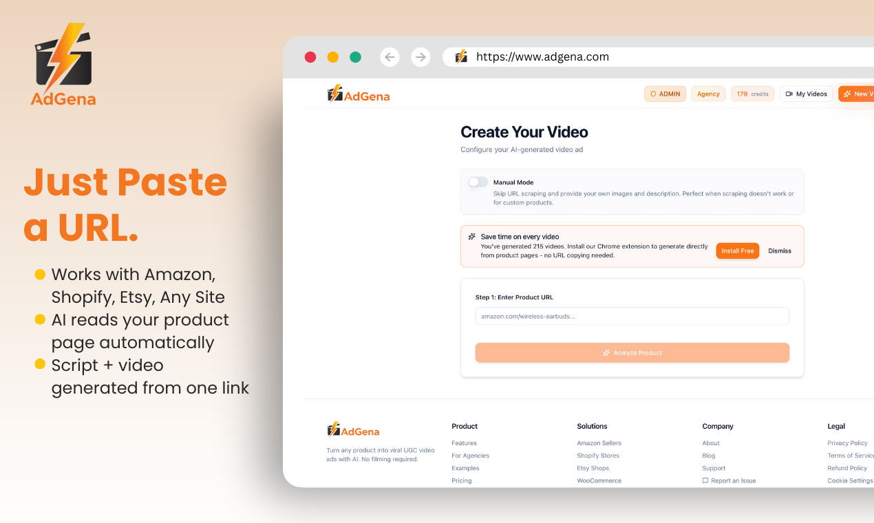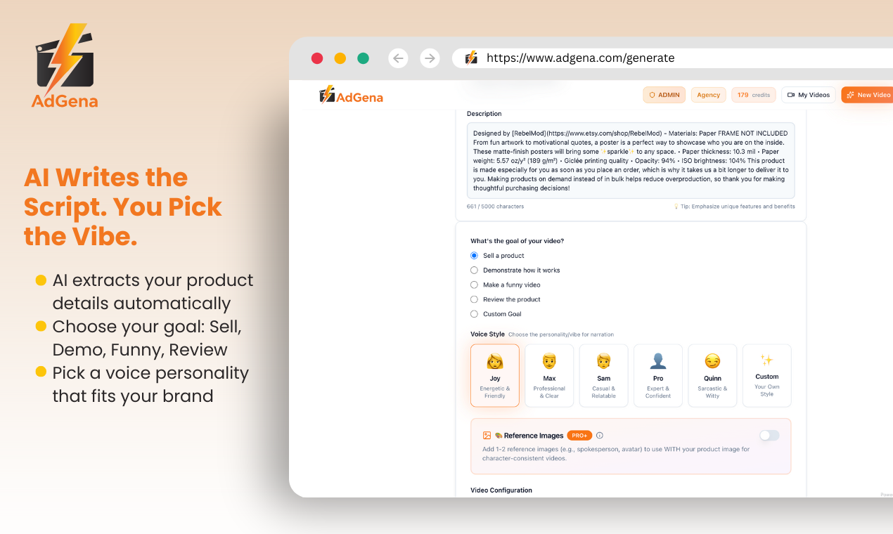 Stop paying $500-5,000 for UGC creators. Stop waiting 2 weeks for delivery. Adgena turns any product URL into a professional video ad in under 2 minutes: → Paste your Amazon, Shopify, Etsy, or TikTok Shop link → AI scrapes product details & generates a UGC-style script → Pick from 24 AI avatars with different accents → Get a 12-second HD video with voiceover $2-4 per video. No filming, no actors, no editing. Launch special: 3 free videos, no credit card required.