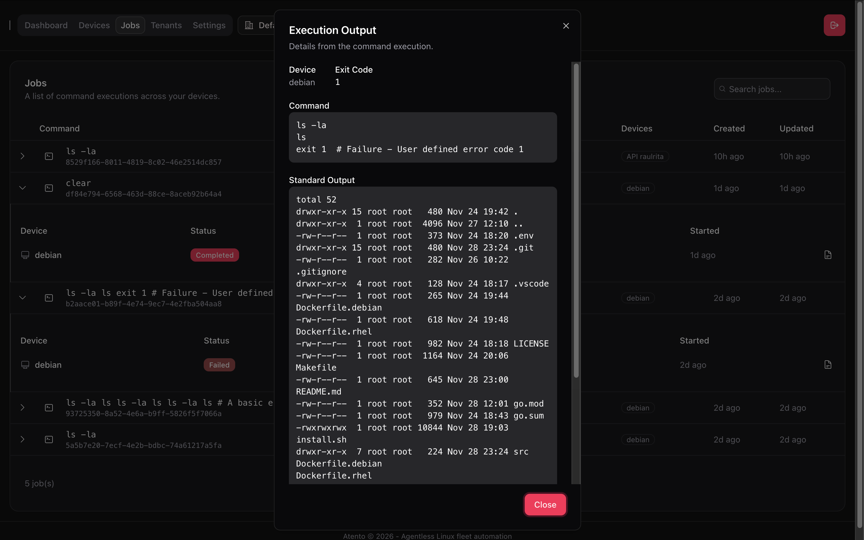 Run commands and scripts across your entire Linux fleet in seconds, all without installing any agents. Atento.dev provides instant, real-time command orchestration and monitoring, simplifying IT operations and reducing infrastructure overhead.