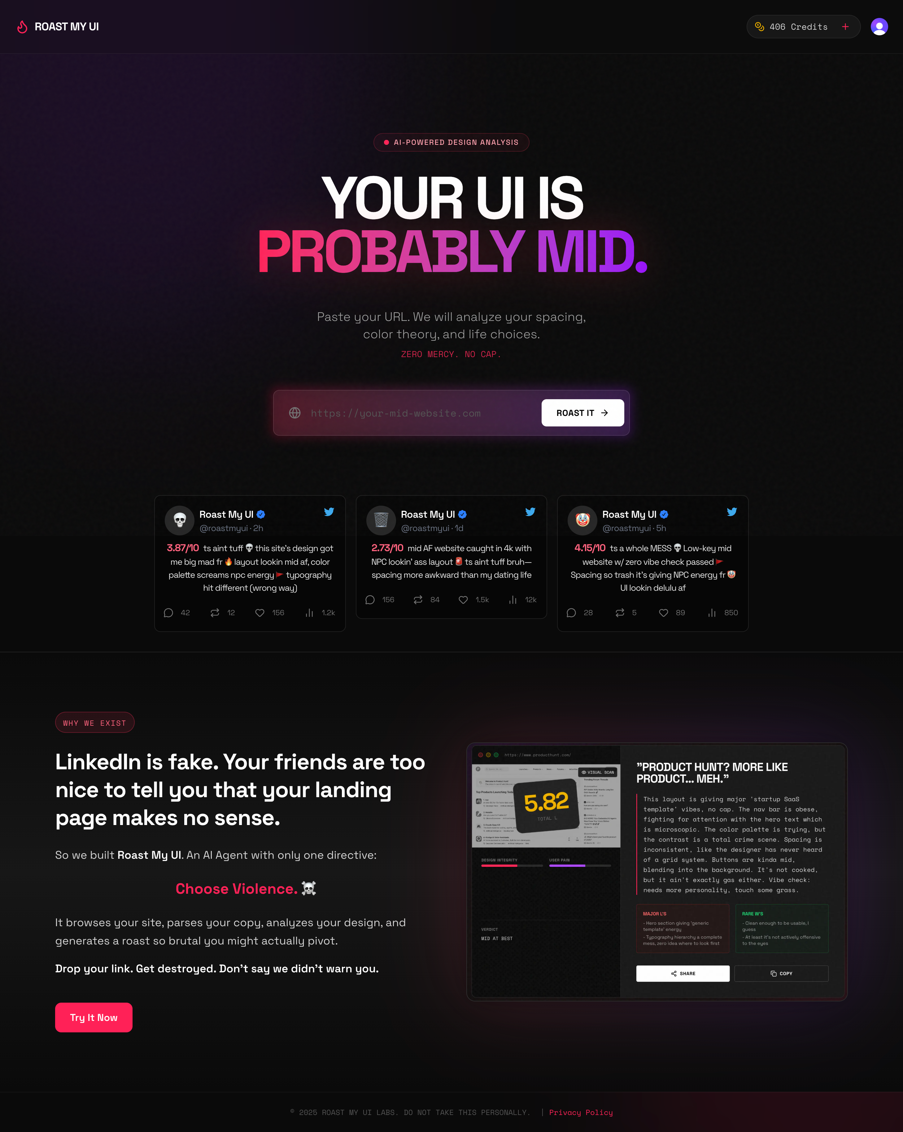 Paste a URL → instant AI roast with actionable fixes