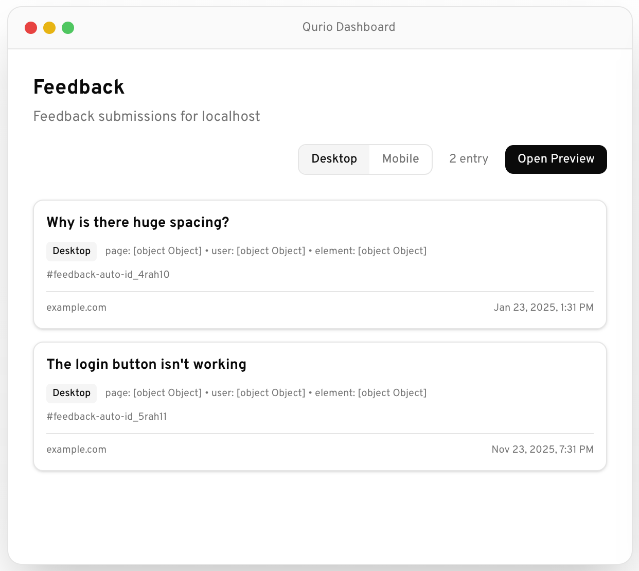 Qurio is a powerful feedback collection platform that allows you to gather contextual user feedback directly from your website. Users can pinpoint exactly where they're experiencing issues or sharing ideas by clicking anywhere on your page.
