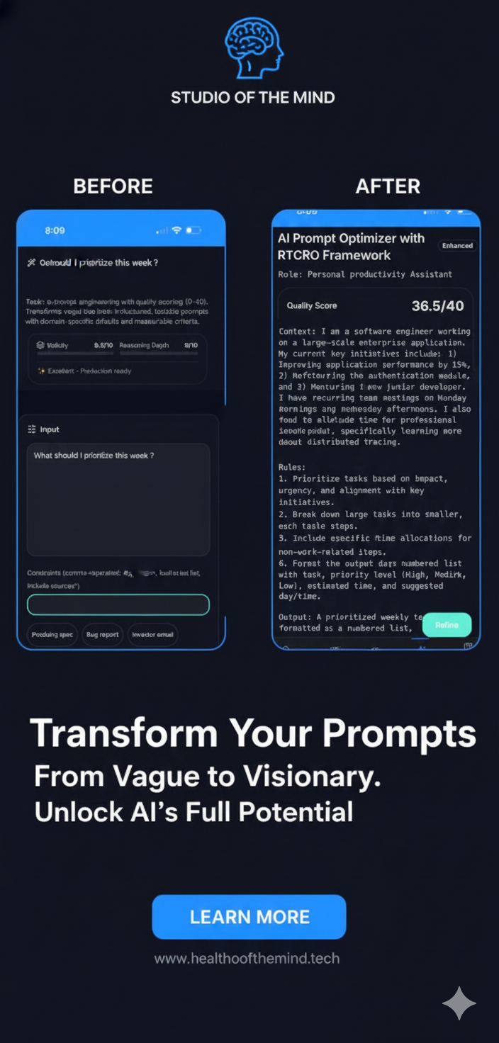 Studio of the Mind redefines AI interaction. Itβs not a chatbot, but a system for sharper questions, stronger prompts, and clearer decisions. It refines your ideas, pressure-tests assumptions, and generates optimized prompts through Adaptive Prompt Intelligence. Its multi-persona engine brings strategist, creator, and skeptic perspectives into one session. With a question-first design, SOTM becomes a personal thinking studio that upgrades how you think, not just what you ask.