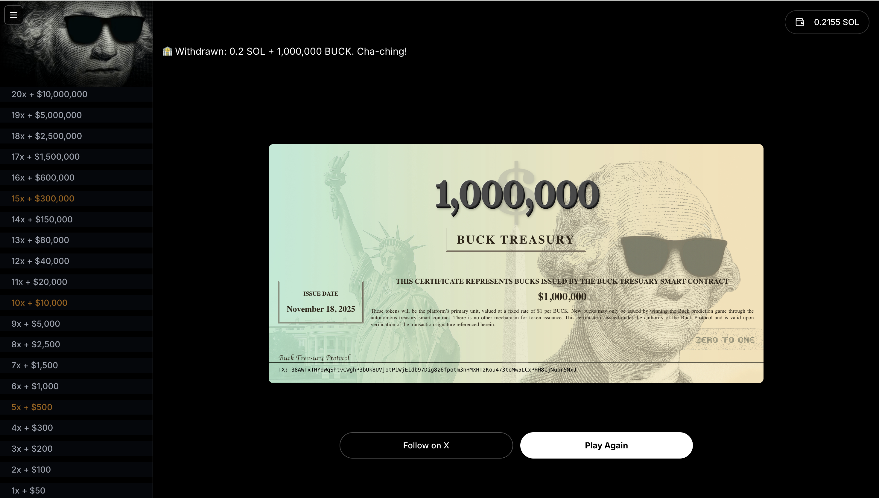 A Fair and Transparent Prediction Game: A 60-second, oracle-driven ladder game where users predict asset price movements for multipliers up to 20x, paid in SOL and the native $BUCK token.