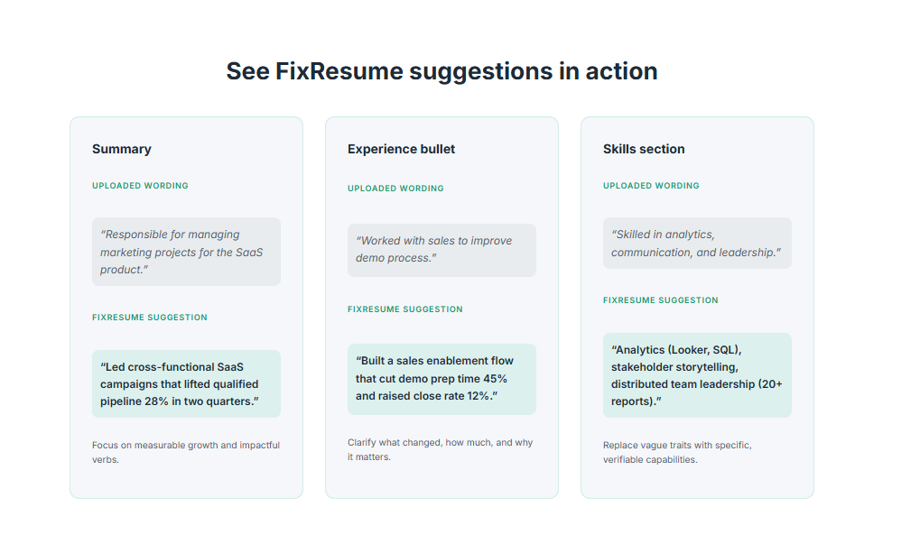 ResumeAITools helps job seekers upgrade their resumes instantly using AI. Upload your resume and our system rewrites weak wording, strengthens impact, adds metrics, and inserts role-specific keywords to improve ATS performance. Unlike traditional resume builders, ResumeAITools focuses on clarity, action verbs, measurable achievements, and perfect keyword alignment with modern hiring systems. You get instant, recruiter-level improvements without manual editing.