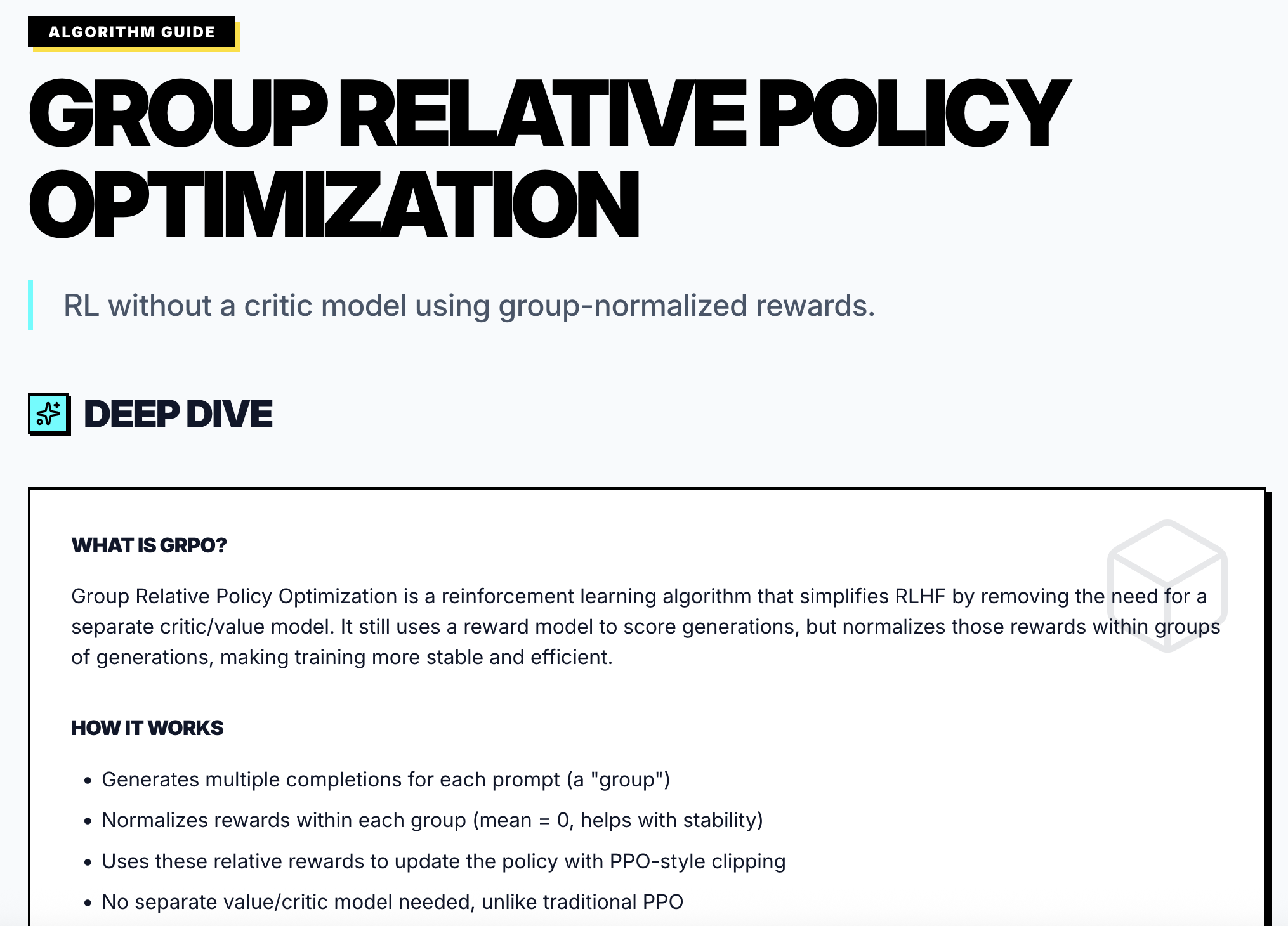 Machine learning metrics and algorithms, explained. A simple math-free resource to learn about the different ML training metrics, including: - Simple definitions and explanations - Visualizations for healthy and unhealthy progressions - Deep dive into reinforcement learning algorithms