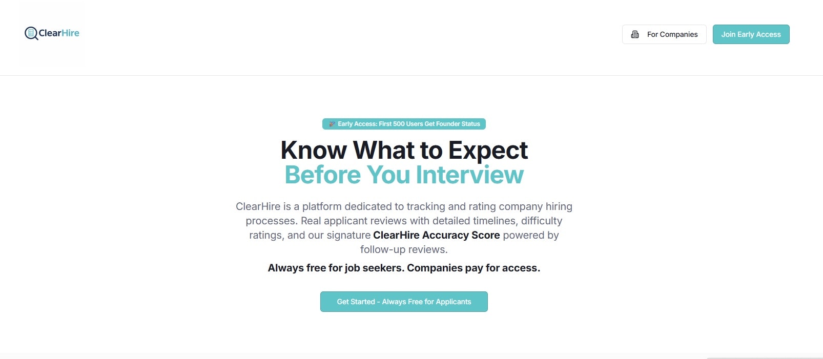 ClearHire brings transparency to the hiring process with anonymous interview reviews, ghosting reports, timelines, and difficulty ratings. Job seekers can see real applicant experiences before applying, while companies get insights to improve their hiring process. Always free for job seekers. Companies pay for premium analytics and responses.